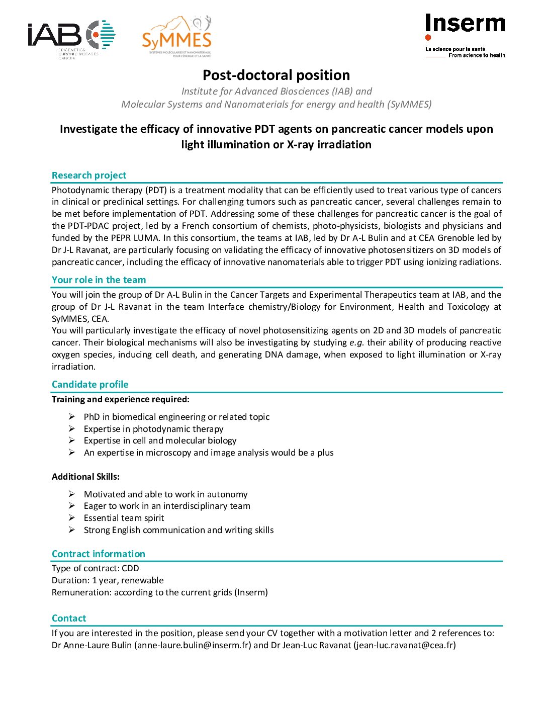 Ce post-doctorat, basé au laboratoire des Systèmes Moléculaires et nanoMatériaux pour l’Énergie et la Santé (SyMMES) et de l’Institut pour l’Avancée des Biosciences (IAB) à Grenoble, a pour sujet d’étudier l’efficacité d’agents PDT innovants sur des modèles de cancer du pancréas après exposition à la lumière ou irradiation aux rayons X.