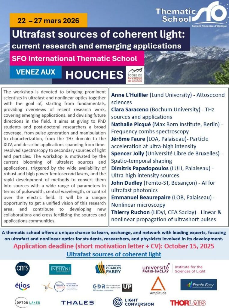 L’école thématique a pour but de rassembler d’éminents scientifiques dans le domaine de l’optique ultrarapide et non linéaire, en commençant par les principes fondamentaux, en fournissant des aperçus des travaux de recherche récents, en couvrant les applications émergentes et en concevant des orientations futures dans le domaine. Il vise à donner aux doctorants et aux chercheurs post-doctoraux une large couverture, de la génération et de la manipulation d’impulsions à la caractérisation, du domaine THz au XUV, et à décrire des applications allant de la spectroscopie résolue en temps aux sources secondaires de lumière et de particules. L’atelier est motivé par la floraison actuelle de sources et d’applications ultrarapides, déclenchée par la large disponibilité de lasers femtosecondes robustes et de haute puissance, et par le développement rapide de méthodes pour les convertir en sources avec une large gamme de paramètres en termes de largeur d’impulsion, de longueur d’onde centrale, ou de contrôle du champ électrique. Ce sera une occasion unique d’obtenir une vision unifiée de ce domaine de recherche, et de contribuer au développement de nouvelles collaborations et à la fertilisation croisée des communautés des sources et des applications.