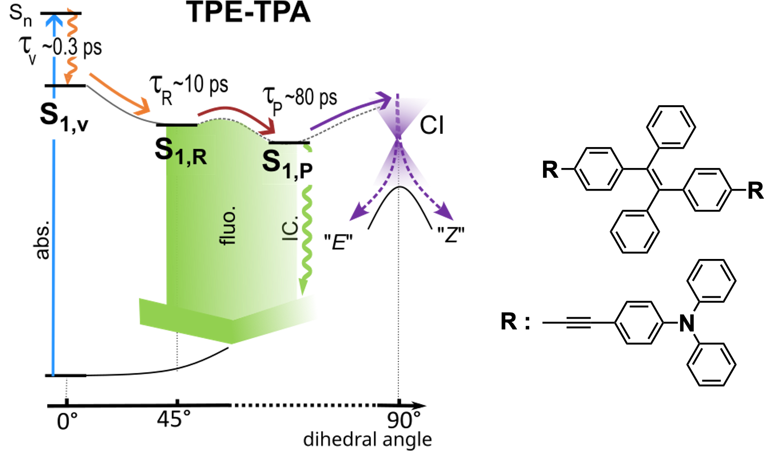 Cette étude permet en particulier de montrer de manière certaine que ce photochromisme s’accompagne d’une diminution marquée du rendement quantique de photoisomérisation par rapport aux TPE non étendus, ce qui concorde avec « l’effet de conjugaison amino » précédemment observé dans les dérivés du stilbène. Dans ce cadre les spectroscopies résolues en temps fournissent des informations cruciales sur le mécanisme gouvernant ce phénomène, révélant l’influence du substituant sur les transitions entre états émissifs et états sombres, ainsi que le retour à l’état fondamental via une intersection conique par rotation de l’état S1 autour de la liaison éthylénique, ce qui est corroboré par des calculs TDDFT. Ces résultats apportent un nouvel éclairage sur les TPE substitués par des donneurs d’électrons et sur leur potentiel en tant que matériaux photochromiques ajustables.